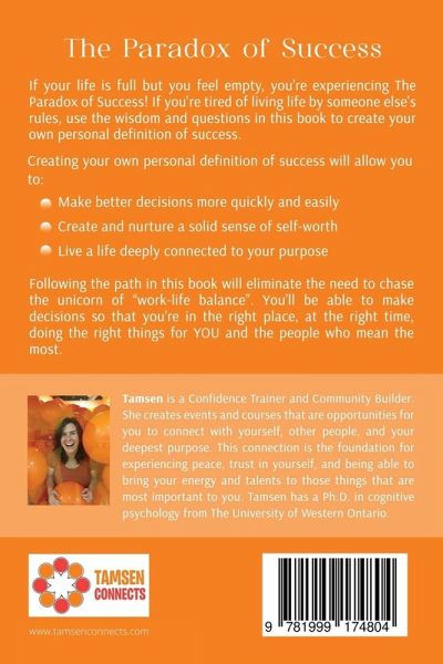 If your life is full but you feel empty, you're experiencing the Paradox of Success! If you're tired of living life by someone else's rules, use the wisdom and questions in this book to create your own personal definition of success. Creating your own personal definition of success will allow you to: - make better decisions more quickly and easily, - create and nurture a solid sense of self-worth, and - live a life deeply connected to your purpose. Following the path in this book will eliminate your need to chase the unicorn of "work-life balance". You'll be able to make decisions so that you're in the right place, at the right time, doing the right things for you and the people who mean the most.