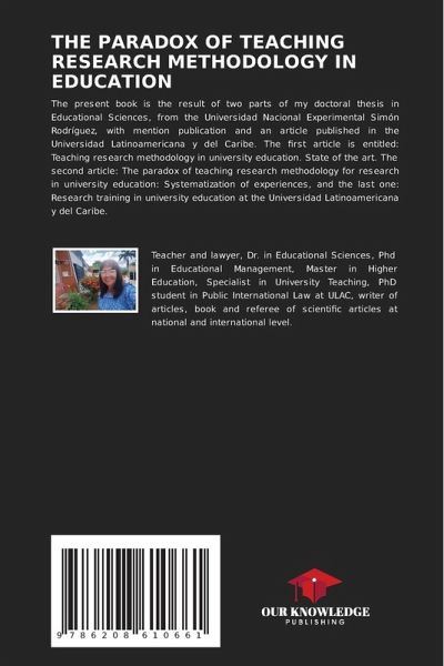 The present book is the result of two parts of my doctoral thesis in Educational Sciences, from the Universidad Nacional Experimental Simón Rodríguez, with mention publication and an article published in the Universidad Latinoamericana y del Caribe. The first article is entitled: Teaching research methodology in university education. State of the art. The second article: The paradox of teaching research methodology for research in university education: Systematization of experiences, and the last one: Research training in university education at the Universidad Latinoamericana y del Caribe.
