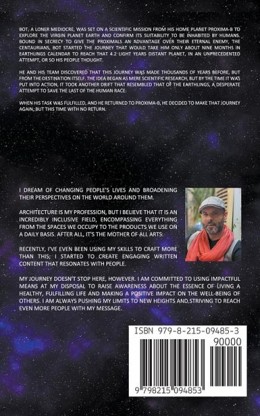 Bot, a loner mediocre, was set on a scientific mission from his home planet Proxima-b to explore the virgin planet Earth and confirm its suitability to be inhabited by humans. Bound in secrecy to give the proximals an advantage over their eternal enemy, the Centaurians, Bot started the journey that would take him only about nine months in Earthlings calendar to reach that 4.2 light years distant planet, in an unprecedented attempt, or so his people thought. He and his team discovered that this journey was made thousands of years before, but from the destination itself. The idea began as mere scientific research, but by the time it was put into action, it took another drift that resembled that of the Earthlings, a desperate attempt to save the last of the human race. When his task was fulfilled, and he returned to Proxima-b, he decided to make that journey again, but this time with no return.