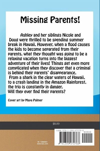 Missing Parents! Ashley and her siblings Nicole and Doug were thrilled to be spending summer break in Hawaii. However, when a flood causes the kids to become separated from their parents, what they thought was going to be a relaxing vacation turns into the biggest adventure of their lives! Things get even more complicated when they discover that a criminal is behind their parents' disappearance. From a shark in the clear waters of Hawaii, to a crash landing in the Amazon Rainforest, the trio is constantly in danger. Will they ever find their parents?