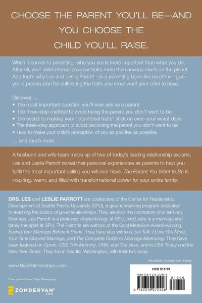 Choose the parent you'll be--and you choose the child you'll raise. When it comes to parenting, who you are is more important than what you do. After all, your child internalizes your traits more than anyone else's on the planet. And that's why Les and Leslie Parrott--in a parenting book like no other--give you a proven plan for cultivating the traits you most want your child to have. Discover: the most important question you'll ever ask as a parent the three-step method to avoid being the parent you don't want to be the secret to making your "intentional traits" stick on even your worst days . . . and much more. A husband and wife team made up of two of today's leading relationship experts, Les and Leslie Parrott reveal their personal experiences as parents to help you fulfill the most important calling you will ever have. The Parent You Want to Be is inspiring, warm, and filled with a transformational power for your entire family.