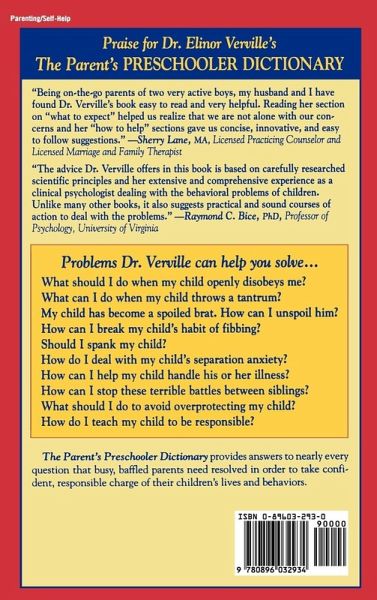 Does your preschooler disobey you, embarrass you, fight you? Does he or she refuse to eat or go to bed, break things, sleepwalk, or fear the dark excessively? Are you confused and uncertain about what attitude you should take towards such issues as spanking, sibling rivalry, favoritism, hospitalization, sex play, and overprotection? Dr. Elinor Verville, a clinical pediatric psychologist with many years of counseling experience, provides in The Parent's Preschooler Dictionary fast, practical, and effective solutions to the most common problems facing today's new and busy parents of preschoolers. Arranged in alphabetical order for rapid access, each concise article briefly illuminates the background of your child's troubling behavior or problem, explains why your preschooler acts as he or she does and advises you with tried-and-tested do's and don't's that you will be able to apply immediately. You can find just what you need to know about nearly any perplexing behavior your child exhibits and learn from Dr. Verville what must be done. The Parent's Preschooler Dictionary will help you gain knowledge and insight into your child and his or her problems, and build your confidence in dealing with trying moments and acquire the management skills you need to handle your child's behavioral problems effectively and well. As you become more confident, your child's anxiety will lessen and his or her emotional stability will increase. You will realize that you are becoming a competent parent, and your children will know that they can count on you to keep them safe, to teach them right from wrong, and to help them learn how to get along with others.