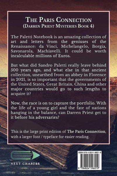 The Paletti Notebook is an amazing collection of art and letters from the geniuses of the Renaissance: da Vinci, Michelangelo, Borgia, Savonarola, Machiavelli. It could be worth incalculable millions of Euros. But what did Sandro Paletti really leave behind 500 years ago, and what else in that ancient collection, unearthed from an abbey in Florence in 2021, is so important that the governments of the United States, Great Britain, China and other major countries would go to such lengths to acquire it? Now, the race is on to capture the portfolio. With the life of a young girl and the fate of nations hanging in the balance, can Darren Priest get to it before his adversaries? This is the large print edition of The Paris Connection, with a larger font / typeface for easier reading.