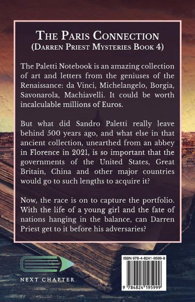 The Paletti Notebook is an amazing collection of art and letters from the geniuses of the Renaissance: da Vinci, Michelangelo, Borgia, Savonarola, Machiavelli. It could be worth incalculable millions of Euros. But what did Sandro Paletti really leave behind 500 years ago, and what else in that ancient collection, unearthed from an abbey in Florence in 2021, is so important that the governments of the United States, Great Britain, China and other major countries would go to such lengths to acquire it? Now, the race is on to capture the portfolio. With the life of a young girl and the fate of nations hanging in the balance, can Darren Priest get to it before his adversaries?