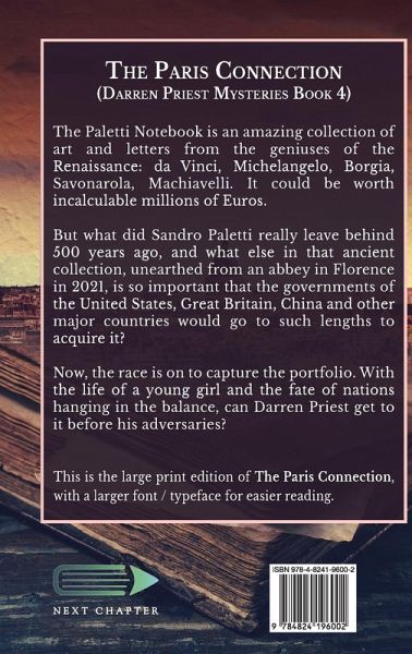 The Paletti Notebook is an amazing collection of art and letters from the geniuses of the Renaissance: da Vinci, Michelangelo, Borgia, Savonarola, Machiavelli. It could be worth incalculable millions of Euros. But what did Sandro Paletti really leave behind 500 years ago, and what else in that ancient collection, unearthed from an abbey in Florence in 2021, is so important that the governments of the United States, Great Britain, China and other major countries would go to such lengths to acquire it? Now, the race is on to capture the portfolio. With the life of a young girl and the fate of nations hanging in the balance, can Darren Priest get to it before his adversaries? This is the large print edition of The Paris Connection, with a larger font / typeface for easier reading.