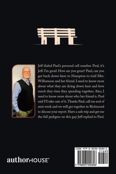 Jeff dialed Paul's personal cell number. Paul, it's Jeff. I'm good. How are you great? Paul, can you get back down here to Hampton to trail Mrs. Williamson and her friend. I need to know more about what they are doing down here and how much they time they spending together. Also, I need to know more about who her friend is. Paul said I'll take care of it. Thanks Paul, call me end of next week and we will get together in Richmond to discuss your report. Have a safe trip and get me the full pedigree on this guy Jeff replied to Paul.