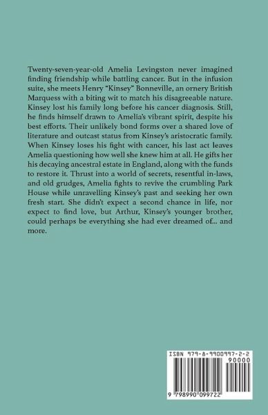 Twenty-seven-year-old Amelia Levingston never imagined finding friendship while battling cancer. But in the infusion suite, she meets Henry "Kinsey" Bonneville, an ornery British Marquess with a biting wit to match his disagreeable nature. Kinsey lost his family long before his cancer diagnosis. Still, he finds himself drawn to Amelia's vibrant spirit, despite his best efforts. Their unlikely bond forms over a shared love of literature and outcast status from Kinsey's aristocratic family. When Kinsey loses his fight with cancer, his last act leaves Amelia questioning how well she knew him at all. He gifts her his decaying ancestral estate in England, along with the funds to restore it. Thrust into a world of secrets, resentful in-laws, and old grudges, Amelia fights to revive the crumbling Park House while unravelling Kinsey's past and seeking her own fresh start. She didn't expect a second chance in life, nor expect to find love, but Arthur, Kinsey's younger brother, could perhaps be everything she had ever dreamed of... and more.