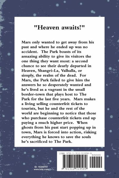 Mars only wanted to get away from his past and where he ended up was no accident. The Park boasts of its amazing ability to give its visitors the one thing they want most: a second chance to see their dearly departed in Heaven, Shangri-La, Valhalla, or simply, the realm of the dead. For Mars, the Park failed to give him the answers he so desperately wanted and he's lived as a vagrant in the small border-town that plays host to The Park for the last five years. Mars makes a living selling counterfeit tickets to tourists, but he and the rest of the world are beginning to notice that those who purchase counterfeit tickets end up paying a much higher price. When ghosts from his past start popping up in town, Mars is forced into action, risking everything he knows to save the souls he's sacrificed to The Park.