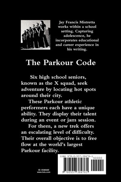 The Parkour Code is a modern fictional novel for young adults. Six high school seniors, known as the X squad, seek adventure by locating hot spots around their city. These Parkour athletic performers each have a unique ability. They display their talent during an event or jam session. Their overall objective is to free flow at the world's largest Parkour facility. *Parkour is the discipline of training the mind and body to overcome obstacles **A freerunner utilizes landscape to perform movement through its structure. By incorporating moves from parkour, an athlete adds creative vaults, tricks, and street stunts over and around obstacles