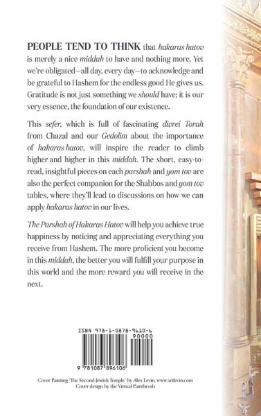 People tend to think that hakaras hatov is merely a nice middah to have and nothing more. Yet we're obligated-all day, every day-to acknowledge and be grateful to Hashem for the endless good He gives us. Gratitude is not just something we should have; it is our very essence, the foundation of our existence. This sefer, which is full of fascinating divrei Torah from Chazal and our Gedolim about the importance of hakaras hatov, will inspire the reader to climb higher and higher in this middah. The short, easy-to-read, insightful pieces on each parshah and yom tov are also the perfect companion for the Shabbos and yom tov tables, where they'll lead to discussions on how we can apply hakaras hatov in our lives. The Parshah of Hakaras Hatov will help you achieve true happiness by noticing and appreciating everything you receive from Hashem. The more proficient you become in this middah, the better you will fulfill your purpose in this world and the more reward you will receive in the next.