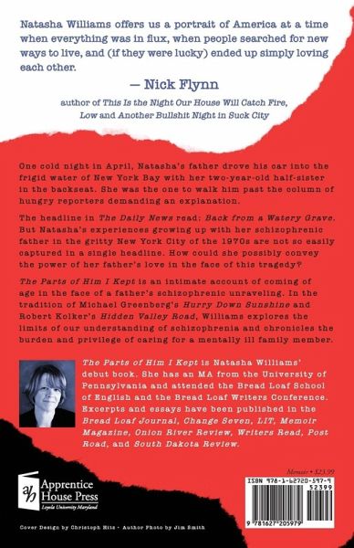 One cold night in April, Natasha's father drove his car into the frigid water of New York Bay with her two-year-old half-sister in the backseat. She was the one to walk him past the column of hungry reporters demanding an explanation. The headline in The Daily News read: Back from a Watery Grave. But Natasha's experiences growing up with her schizophrenic father in the gritty New York City of the 1970s are not so easily captured in a single headline. How could she possibly convey the power of her father's love in the face of this tragedy? The Parts of Him I Kept is an intimate account of coming of age in the face of a father's schizophrenic unraveling. In the tradition of Michael Greenberg's Hurry Down Sunshine and Robert Kolker's Hidden Valley Road, Williams explores the limits of our understanding of schizophrenia and chronicles the burden and privilege of caring for a mentally ill family member.