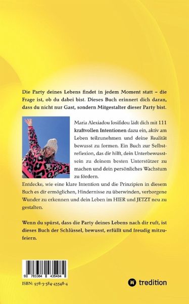 Deine Eintrittskarte zur Party des Lebens: Die Kraft des Intention Setting entdeckenBist du bereit, dein Leben bewusst zu gestalten? Dieses Buch gibt dir die Werkzeuge an die Hand, um mit klaren Intentionen dein Denken, Fühlen und Handeln auszurichten - und dadurch tiefgreifende Veränderungen zu erleben. Die 111 kraftvollen Intentionen in diesem Buch sind mehr als nur Affirmationen. Sie sind ein Kompass, der dich jeden Tag daran erinnert, wie viel Einfluss du auf dein eigenes Leben hast. Du lernst, wie du mit gezielten Absichten deine Energie erhöhst, dein Unterbewusstsein neu programmierst und in den Flow kommst - egal, wo du gerade stehst. Was dieses Buch für dich tun kann: Sofortige Klarheit und Fokus - Setze bewusste Absichten für dein Leben. Emotionale Stärke und Vertrauen - Lerne, mit Unsicherheiten umzugehen und dem Leben zu vertrauen. Manifestation in Aktion - Verstehe, wie deine Gedanken Realität erschaffen. Leichte Umsetzung - Ein einfacher 8-Schritte-Ansatz, der dich sanft durch den Prozess führt. Praktische Anwendung im Alltag - Perfekt für Morgenroutinen, Reflexion oder Coaching-Sitzungen. Dieses Buch ist dein persönlicher Begleiter für Wachstum, Veränderung und ein Leben voller Freude. Es lädt dich ein, in die Party des Lebens einzutauchen - voller Vertrauen, Leichtigkeit und Magie. Jetzt ist der perfekte Moment, deine erste Intention zu setzen. Bist du bereit?