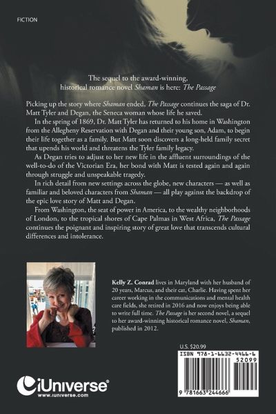 The sequel to the award-winning, historical romance novel Shaman is here: The Passage Picking up the story where Shaman ended, The Passage continues the saga of Dr. Matt Tyler and Degan, the Seneca woman whose life he saved. In the spring of 1869, Dr. Matt Tyler has returned to his home in Washington from the Allegheny Reservation with Degan and their young son, Adam, to begin their life together as a family. But Matt soon discovers a long-held family secret that upends his world and threatens the Tyler family legacy. As Degan tries to adjust to her new life in the affluent surroundings of the well-to-do of the Victorian Era, her bond with Matt is tested again and again through struggle and unspeakable tragedy. In rich detail from new settings across the globe, new characters - as well as familiar and beloved characters from Shaman - all play against the backdrop of the epic love story of Matt and Degan. From Washington, the seat of power in America, to the wealthy neighborhoods of London, to the tropical shores of Cape Palmas in West Africa, The Passage continues the poignant and inspiring story of great love that transcends cultural differences and intolerance.