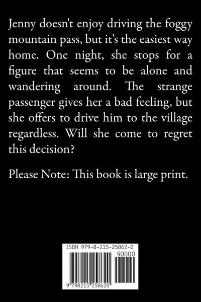 Jenny doesn't enjoy driving the foggy mountain pass, but it's the easiest way home. One night, she stops for a figure that seems to be alone and wandering around. The strange passenger gives her a bad feeling, but she offers to drive him to the village regardless. Will she come to regret this decision? Note: This book is large print.