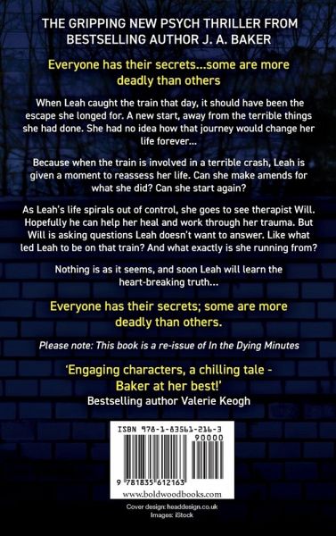 A gripping psychological thriller from top 50 bestselling author J A Baker, guarenteed to keep you turning the pages! Everyone has their secrets...some are more deadly than others. When Leah caught the train that day, it should have been the escape she longed for. A new start, away from the terrible things she had done. She had no idea how that jounrey would change her life forever... Because when the train is involved in a terrible crash, Leah is given a moment to reassess her life. Can she make amends for what she did? Can she start again? As Leah's life spirals out of control, she goes to see therapist Will. Hopefully he can help her heal and work through her trauma. But Will is asking questions Leah doesn't want to answer. Like what led Leah to be on that train? And what exactly is she running from? Nothing is as it seems, and soon Leah will learn the heart-breaking truth... Everyone has their secrets; some are more deadly than others. Please note: This book was originially published as In The Dying Minutes. A gripping psychological thriller that will keep you on the edge of your seat. Perfect for fans of Valerie Keogh, Diana Wilkinson and Keri Beevis. What people are saying about J.A.Baker "Engaging characters, a chilling tale - Baker at her best!" Bestselling author Valerie Keogh. "A dark and twisting thrill ride that asks the question: how well do you really know your parents? It kept me hooked until the final page!" Bestselling author M.A. Hunter. "A dark and twisty thriller that keep you guessing at the truth, The Perfect Parents is an addictive read!" Bestselling author Alison Stockham. "This captivating pacy thriller sucks you in from the first page and spits you out at the last! I thought I'd worked it out, but no... the twists kept coming and the final reveal is a heartbreaker