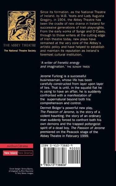 An ordinary man is forced to confront both his own demons and the manifestation of the supernatural beyond his comprehension and control Jeremy Furlong is a successful businessman, whose life has been carefully constructed from layer upon layer of lies. That is until now, when he is confronted by the trapped poltergeist spirit of a dead boy in the squalid flat he using to have an affair. The Passion of Jerome premiered at the Peacock stage of the Abbey Theatre in February 1999. "A writer of frenetic energy and imagination." (Sunday Times)