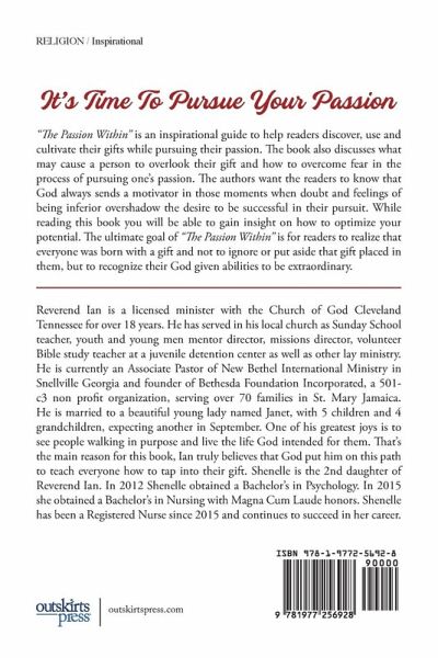 "The Passion Within" is an inspirational guide to help readers discover, use and cultivate their gifts while pursuing their passion. The book also discusses what may cause a person to overlook their gift and how to overcome fear in the process of pursuing one's passion. The authors want the readers to know that God always sends a motivator in those moments when doubt and feelings of being inferior overshadow the desire to be successful in their pursuit. While reading this book you will be able to gain insight on how to optimize your potential. The ultimate goal of "The Passion Within" is for readers to realize that everyone was born with a gift and not to ignore or put aside that gift placed in them, but to recognize their God given abilities to be extraordinary.
