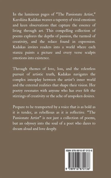 In the luminous pages of "The Passionate Artist," Karoliina Kadakas weaves a tapestry of vivid emotions and keen observations that capture the essence of living through art. This compelling collection of poems explores the depths of passion, the turmoil of creativity, and the solace found in expression. Kadakas invites readers into a world where each stanza paints a picture and every verse sculpts emotions into existence. Through themes of love, loss, and the relentless pursuit of artistic truth, Kadakas navigates the complex interplay between the artist's inner world and the external realities that shape their vision. Her poetry resonates with anyone who has ever felt the stirrings of creativity or the ache of unspoken desires. Prepare to be transported by a voice that is as bold as it is tender, as rebellious as it is reflective. "The Passionate Artist" is not just a collection of poems, but an odyssey into the soul of a poet who dares to dream aloud and love deeply. Copyright © 2024 Book Fairy Publishing