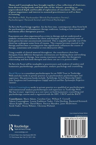 Mann Cunningham Introduction. Mann Enactments and Trauma: The Therapist's Vulnerability as the Theatre for the Patient's Trauma. Cunningham Mutual Enactments Within the Therapeutic Relationship. Adams The Abandonment: Enactments from the Patient's Sadism and the Therapist's Collusion. Harding The Ghost at the Feast: Enactments of Cumulative Trauma in the Therapeutic Relationship. Cornell Loves and Losses: Enactments in the Disavowal of Intimate Desires. Case Action Enactment and Moments of Meeting in Therapy with Children. Kenward Bad Faith in Practice: Enactments in Existential Psychotherapy. Marsden Knight-Evans Tangled Webs: Enactments on an Inpatient Ward for Eating Disorders. Embleton Tudor Tudor Past Present: Person-Centred Therapy with Trauma and Enactment. Webster The Therapist as a 'Bad Object': The Use of Countertransference Enactment to Facilitate Psychoanalytic Therapy. McDermott Working with Refugees: An Enactment and Guilt. Wieland Chronic and Acute Enactment: The Passive Therapist and the Perverse Transference.