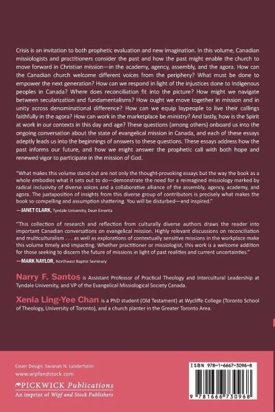 Crisis is an invitation to both prophetic evaluation and new imagination. In this volume, Canadian missiologists and practitioners consider the past and how the past might enable the church to move forward in Christian mission--in the academy, agency, assembly, and the agora. How can the Canadian church welcome different voices from the periphery? What must be done to empower the next generation? How can we respond in light of the injustices done to our Indigenous brothers and sisters? Where does reconciliation fit into the picture? How might we navigate between secularization and fundamentalisms? How ought we move together in mission and in unity across denominational difference? How can we equip laypeople to live their callings faithfully in the agora? How can work in the marketplace be ministry? And lastly, how is the Spirit at work in our contexts in this day and age? These questions (among others) onboard us into the ongoing conversation about the state of evangelical mission in Canada, and each of these essays adeptly lead us into the beginnings of answers to these questions. These essays address how the past informs our future, and how we might answer the prophetic call with both hope and renewed vigor to participate in the mission of God.