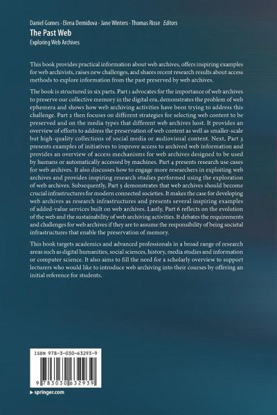 Part I: The Era of Information Abundance and Memory Scarcity.- The Problem of Web Ephemera.- Web Archives Preserve Our Digital Collective Memory.- Part II Collecting Before It Vanishes.- National Web Archiving in Australia: Representing the Comprehensive.- Web Archiving in Singapore: The Realities of National Web Archiving.- Archiving Social Media: The Case of Twitter.- Part III: Access Methods to Analyse the Past Web.- Full-Text and URL Search Over Web Archives.- A Holistic View on Web Archives.- Interoperability for Accessing Versions of Web Resources with the Memento Protocol.- Linking Twitter Archives with Television Archives.- Image Analytics in Web Archives.- Part IV: Researching the Past Web.- Digital Archaeology in the Web of Links: Reconstructing a Late-1990sWeb Sphere.- Quantitative Approaches to the Danish Web Archive.- Critical Web Archive Research.- Exploring Online Diasporas: London's French and Latin American Communities in the UK Web Archive.- Platform and AppHistories: Assessing Source Availability in Web Archives and App Repositories.- Part V: Web Archives as Infrastructures to Develop Innovative Services.- The Need for Research Infrastructures for the Study of Web Archives.- Automatic Generation of Timelines for Past-Web Events.- Political Opinions on the Past Web.- Oldweb.today: Browsing the Past Web with Browsers from the Past.- Big Data Science Over the Past Web.- Part VI: A Look into the Future.- The Past Web: A Look into the Future.