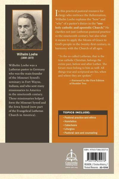 In this practical pastoral resource for clergy who embrace the Reformation, Wilhelm Loehe explains the "how" and "why" of a pastor's duties in the "one holy catholic and apostolic church." He clarifies not just Lutheran pastoral practice in the nineteenth century, but also what it means to apply the Means of Grace to God's people in the twenty-first century, in harmony with the Church of all ages.