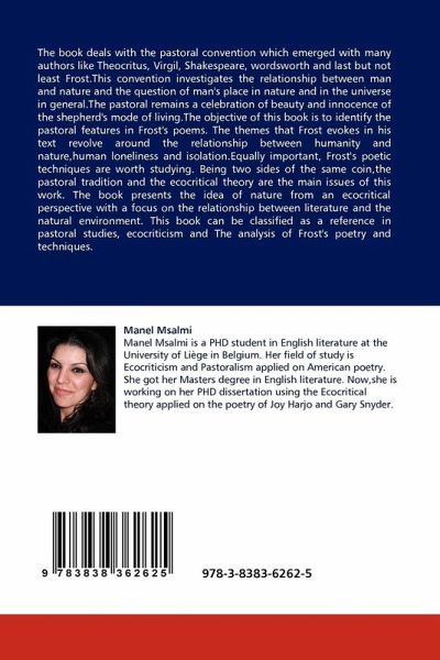 The book deals with the pastoral convention which emerged with many authors like Theocritus, Virgil, Shakespeare, wordsworth and last but not least Frost.This convention investigates the relationship between man and nature and the question of man's place in nature and in the universe in general.The pastoral remains a celebration of beauty and innocence of the shepherd's mode of living.The objective of this book is to identify the pastoral features in Frost's poems. The themes that Frost evokes in his text revolve around the relationship between humanity and nature,human loneliness and isolation.Equally important, Frost's poetic techniques are worth studying. Being two sides of the same coin,the pastoral tradition and the ecocritical theory are the main issues of this work. The book presents the idea of nature from an ecocritical perspective with a focus on the relationship between literature and the natural environment. This book can be classified as a reference in pastoral studies, ecocriticism and The analysis of Frost's poetry and techniques.