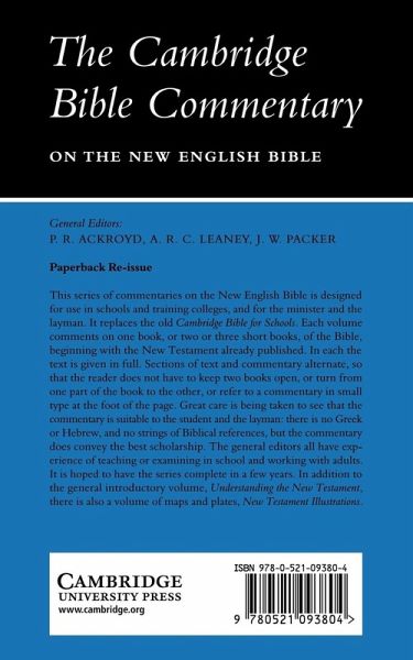 This series of commentaries on the New English Bible is designed for use in schools and colleges, and for the minister and the layman. Each volume comments on one book, or part, of the Bible. In each the text is given in full. Sections of text and commentary alternate, so that the reader does not have to keep two books open, or turn from one part of the book to the other, or refer to a commentary in small type at the foot of the page. Great care has been taken to see that the commentary is suitable for the student and the layman: there is no Greek or Hebrew, and no strings of biblical references. The general editors all have experience of teaching or examining in school and working with adults. Commentaries on all the books of the Old Testament, New Testament and Apocrypha have been published, together with introductory volumes and books of illustrations to accompany each Testament.