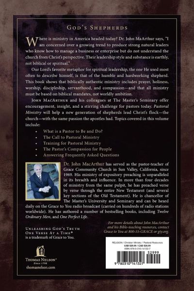 Pastor John MacArthur combines his passion for the Bible with the training expertise of faculty members at The Master's Seminary to guide seminary students and ministry leaders in developing their pastoral ministry skills. Pastors today can easily become preoccupied with the many pitfalls of modern culture, buying into the idea of image and straying from Jesus's call to shepherd leadership. Pastoral Ministry: How to Shepherd Biblically presents a practical pastoral theology aimed at showing pastors and pastors-in-training the vital role God's word plays in shaping the preparation and maintaining the priorities of pastoring. The authors examine the biblical teaching about the high and demanding call to ministry required of any spiritual shepherd. You'll learn how to pursue intentional growth through the stages of calling, training, and ministering to God's church--along the way, uncovering answers to questions such as: How does the Bible establish a philosophy of pastoral ministry, and what is it? Who is personally qualified to be an undershepherd of God's flock? What are the biblical preparations required of shepherd leaders? What priority does God's word place on activities involved in pastoral ministry? United in affirming shepherd leadership as the biblical model for pastoral ministry, The Master's Seminary faculty contributes a treasury of expertise alongside insights from well-known Bible teacher John MacArthur. This book will inspire any pastor dedicated to serving God's church in the pattern of Jesus Christ.