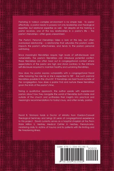 This book examines the pastor's friendships as they impact a pastor's effectiveness in ministry and his or her personal well-being. Because friendships require high levels of self-disclosure, friendships introduce potential conflict for the pastor as personal self-disclosure may conflict with the pastor's expected role. Taking a qualitative approach, this study looks at how pastors navigate the areas of friendship both inside and outside their congregations. The research involved interviews with ten congregational pastors and reports themes that emerged from the interviews. The researcher developed four friendship types that assist the pastor in balancing pastoral role expectation with expression of vulnerability.