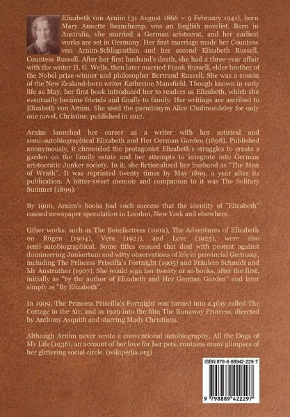 Elizabeth von Arnim has that elusive quality, wit. Unlike humor or books written to amuse and entertain, wit must be appreciated through the lens of the reader's own experiences. You read a sentence or paragraph, nodding your head and chuckling because you get it. And you feel intelligent because of that, knowing that not everyone will. This whole book was that way, as was "Elizabeth and her German Garden", the previous von Arnim book I read. Added to that, most of her books contain autobiographical elements, making you wish you could have known the author herself. This was the story of a young girl, who got herself engaged to a German pastor by mistake, but sees it as a chance to escape her domineering father. Our of the frying pan into the fire, as they say. That's the basic plot, but after 6 pregnancies in 7 years, and life in a provincial Prussian village married to a man who takes her for granted, she finds another avenue for escape. (Diane Barnes) About Elizabeth von Arnim: Elizabeth von Arnim (31 August 1866 - 9 February 1941), born Mary Annette Beauchamp, was an English novelist. Born in Australia, she married a German aristocrat, and her earliest works are set in Germany. Her first marriage made her Countess von Arnim-Schlagenthin and her second Elizabeth Russell, Countess Russell. After her first husband's death, she had a three-year affair with the writer H. G. Wells, then later married Frank Russell, elder brother of the Nobel prize-winner and philosopher Bertrand Russell. She was a cousin of the New Zealand-born writer Katherine Mansfield. Though known in early life as May, her first book introduced her to readers as Elizabeth, which she eventually became friends and finally to family. Her writings are ascribed to Elizabeth von Arnim. She used the pseudonym Alice Cholmondeley for only one novel, Christine, published in 1917. Arnim launched her career as a writer with her satirical and semi-autobiographical Elizabeth and Her German Garden (1898). Published anonymously, it chronicled the protagonist Elizabeth's struggles to create a garden on the family estate and her attempts to integrate into German aristocratic Junker society. In it, she fictionalized her husband as "The Man of Wrath". It was reprinted twenty times by May 1899, a year after its publication. A bitter-sweet memoir and companion to it was The Solitary Summer (1899). By 1900, Arnim's books had such success that the identity of "Elizabeth" caused newspaper speculation in London, New York and elsewhere. Other works, such as The Benefactress (1902), The Adventures of Elizabeth on Rügen (1904), Vera (1921), and Love (1925), were also semi-autobiographical. Some titles ensued that deal with protest against domineering Junkertum and witty observations of life in provincial Germany, including The Princess Priscilla's Fortnight (1905) and Fräulein Schmidt and Mr Anstruther (1907). She would sign her twenty or so books, after the first, initially as "by the author of Elizabeth and Her German Garden" and later simply as "By Elizabeth". In 1909, The Princess Priscilla's Fortnight was turned into a play called The Cottage in the Air, and in 1929 into the film The Runaway Princess, directed by Anthony Asquith and starring Mady Christians. Although Arnim never wrote a conventional autobiography, All the Dogs of My Life (1936), an account of her love for her pets, contains many glimpses of her glittering social circle. (wikipedia.org)