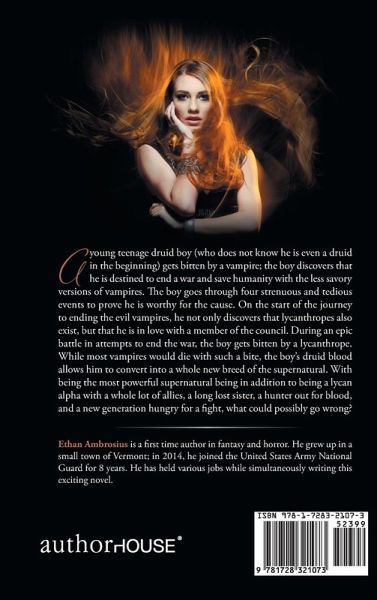 A young teenage druid boy (who does not know he is even a druid in the beginning) gets bitten by a vampire; the boy discovers that he is destined to end a war and save humanity with the less savory versions of vampires. The boy goes through four strenuous and tedious events to prove he is worthy for the cause. On the start of the journey to ending the evil vampires, he not only discovers that lycanthropes also exist, but that he is in love with a member of the council. During an epic battle in attempts to end the war, the boy gets bitten by a lycanthrope. While most vampires would die with such a bite, the boy's druid blood allows him to convert into a whole new breed of the supernatural. With being the most powerful supernatural being in addition to being a lycan alpha with a whole lot of allies, a long lost sister, a hunter out for blood, and a new generation hungry for a fight, what could possibly go wrong?