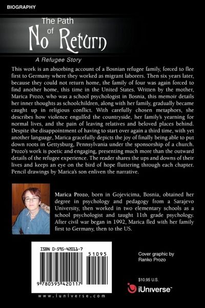 This work is an absorbing account of a Bosnian refugee family, forced to flee first to Germany where they worked as migrant laborers. Then six years later, because they could not return home, the family of four was again forced to find another home, this time in the United States. Written by the mother, Marica Prozo, who was a school psychologist in Bosnia, this memoir details her inner thoughts as schoolchildren, along with her family, gradually became caught up in religious conflict. With carefully chosen metaphors, she describes how violence engulfed the countryside, her family's yearning for normal lives, and the pain of leaving relatives and beloved places behind. Despite the disappointment of having to start over again a third time, with yet another language, Marica gracefully depicts the joy of finally being able to put down roots in Gettysburg, Pennsylvania under the sponsorship of a church. Prozo's work is poetic and engaging, presenting much more than the outward details of the refugee experience. The reader shares the ups and downs of their lives and keeps an eye on the bird of hope fluttering through each chapter. Pencil drawings by Marica's son enliven the narrative.