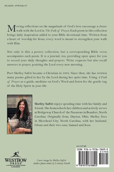 Moving reflections on the magnitude of God's love encourage a closer walk with the Lord in The Path of Prayer. Each poem in this collection brings daily inspiration added to your Bible devotional time. Written from a heart of worship for Jesus, every word is meant to strengthen your walk with Him. Not only is this a poetry collection, but a corresponding Bible verse accompanies each poem. It is a journal, too, providing open space for you to record your daily thoughts and prayers. Write requests but also recall answers to prayer, praising the Lord every new morning. Poet Shelley Safrit became a Christian in 1994. Since then, she has written many poems gifted to her by the Lord during her quiet time. Using A Path of Prayer as a guide, meditate on God's Word and listen for the gentle tug of the Holy Spirit in your life.