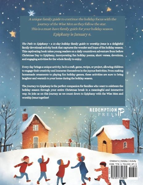 A unique family guide to continue the holiday focus with the journey of the Wise Men as they follow the star. A must-have family guide for your holiday season. Epiphany is January 6. The Path to Epiphany ¿ a 21-day holiday family guide to worship Jesus is a delightful family devotional activity book that captures the wonder and hope of the holiday season. This captivating book takes young readers on a daily countdown adventure from before Christmas Day to Epiphany, incorporating fun holiday poems, short verses, devotions, and engaging activities for the whole family to enjoy. Every day brings a unique activity, be it a craft, game, recipe, or project, allowing children to engage their creativity and immerse themselves in the joyous festivities. From making homemade ornaments to playing fun holiday games, these activities are sure to bring laughter and warmth to your home during the holiday season. The Path to Epiphany is the perfect companion for families who want to celebrate the holiday season through your entire Christmas break in a meaningful and interactive way. So join us on this journey as we count down to Epiphany with the Wise Men and worship Jesus together!