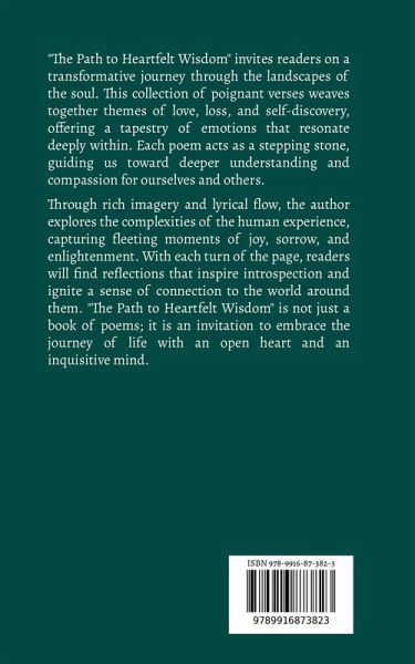 "The Path to Heartfelt Wisdom" invites readers on a transformative journey through the landscapes of the soul. This collection of poignant verses weaves together themes of love, loss, and self-discovery, offering a tapestry of emotions that resonate deeply within. Each poem acts as a stepping stone, guiding us toward deeper understanding and compassion for ourselves and others. Through rich imagery and lyrical flow, the author explores the complexities of the human experience, capturing fleeting moments of joy, sorrow, and enlightenment. With each turn of the page, readers will find reflections that inspire introspection and ignite a sense of connection to the world around them. "The Path to Heartfelt Wisdom" is not just a book of poems; it is an invitation to embrace the journey of life with an open heart and an inquisitive mind.