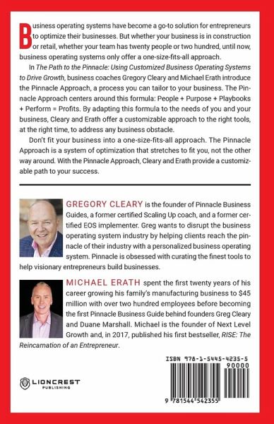 Unlock the true potential of your business with The Path to the Pinnacle: Using Customized Business Operating Systems to Drive Growth. In this compelling and insightful book, filled with real-world examples and stories of entrepreneurs who have moved on from restrictive, one-size-fits-all Business Operating Systems to a new and customizable approach, esteemed business coaches Gregory Cleary and Michael Erath revolutionize the way entrepreneurs approach business optimization. Say goodbye to the limitations of one-size-fits-all solutions that fail to address the unique challenges faced by your industry and team size. Cleary and Erath introduce the groundbreaking Pinnacle Approach, a customizable process designed to empower you to tailor your business operating system to your specific needs. The Pinnacle Approach is built upon a powerful formula: People + Purpose + Playbooks + Perform = Profits. This formula serves as the foundation for success, allowing you to adapt and refine your strategies to achieve maximum growth and profitability. Cleary and Erath guide you through each step, providing invaluable insights and practical tools to overcome any obstacle that stands in your way. Embrace a new era of business optimization where you no longer force your business into a predetermined mold, but rather shape the operating system to fit you. The Pinnacle Approach offers a revolutionary system that stretches and flexes to accommodate your unique requirements, enabling you to reach the summit of success. With their expertise and guidance, Cleary and Erath empower you to customize your path to success. Experience the transformative power of a truly tailored business operating system and unlock unparalleled growth and profitability. The Path to the Pinnacle is your roadmap to achieving extraordinary results in today's dynamic business landscape.