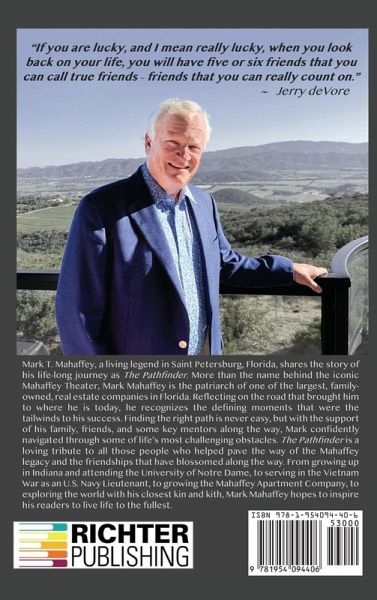 Mark T. Mahaffey, a living legend in Saint Petersburg, Florida, shares the story of his life-long journey as The Pathfinder.More than the name behind the iconic Mahaffey Theater, Mark Mahaffey is the patriarch of one of the largest, family-owned, real estate companies in Florida. Reflecting on the road that brought him to where he is today, he recognizes the defining moments that were the tailwinds to his success. Finding the right path is never easy, but with the support of his family, friends, and some key mentors along the way, Mark confidently navigated through some of life's most challenging obstacles. The Pathfinder is a loving tribute to all those people who helped pave the way of the Mahaffey legacy and the friendships that have blossomed along the way. From growing up in Indiana and attending the University of Notre Dame, to serving in the Vietnam War as a U.S. Navy Lieutenant, to growing the Mahaffey Apartment Company, to exploring the world with his closest kin and kith, Mark Mahaffey hopes to inspire his readers to live life to the fullest.
