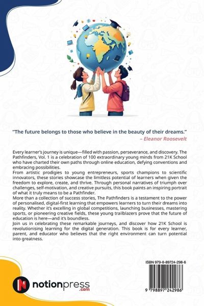 "The future belongs to those who believe in the beauty of their dreams." - Eleanor Roosevelt Every learner' s journey is unique-filled with passion, perseverance, and discovery. The Pathfinders, Vol.1 is a celebration of 100 extraordinary young minds from 21K School who have charted their own paths through online education, defying conventions and embracing possibilities. From artistic prodigies to young entrepreneurs, sports champions to scientific innovators, these stories showcase the limitless potential of learners when given the freedom to explore, create, and thrive. Through personal narratives of triumph over challenges, self-motivation, and creative pursuits, this book paints an inspiring portrait of what it truly means to be a Pathfinder. More than a collection of success stories, The Pathfinders is a testament to the power of personalised, digital-first learning that empowers learners to turn their dreams into reality. Whether it' s excelling in global competitions, launching businesses, mastering sports, or pioneering creative fields, these young trailblazers prove that the future of education is here-and it' s boundless. Join us in celebrating these remarkable journeys, and discover how 21K School is revolutionising learning for the digital generation. This book is for every learner, parent, and educator who believes that the right environment can turn potential into greatness.