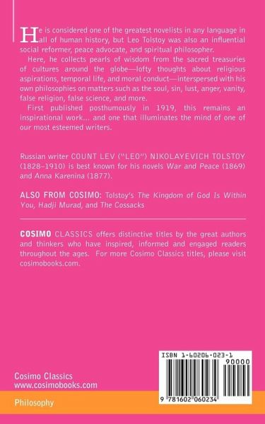 He is considered one of the greatest novelists in any language in all of human history, but Leo Tolstoy was also an influential social reformer, peace advocate, and spiritual philosopher. Here, he collects pearls of wisdom from the sacred treasuries of cultures around the globe-lofty thoughts about religious aspirations, temporal life, and moral conduct-interspersed with his own philosophies on matters such as the soul, sin, lust, anger, vanity, false religion, false science, and more. First published posthumously in 1919, this remains an inspirational work... and one that illuminates the mind of one of our most esteemed writers. Russian writer COUNT LEV ("LEO") NIKOLAYEVICH TOLSTOY (1828-1910) is best known for his novels War and Peace (1869) and Anna Karenina (1877). ALSO FROM COSIMO: Tolstoy's The Kingdom of God Is Within You, Hadji Murad, and The Cossacks