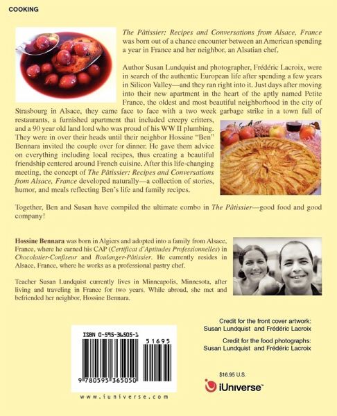 The Pâtissier: Recipes and Conversations from Alsace, France was born out of a chance encounter between an American spending a year in France and her neighbor, an Alsatian chef. Author Susan Lundquist and photographer, Frédéric Lacroix were in search of the authentic European life after spending a few years in Silicon Valley- and they ran right into it. Just days after moving into their new apartment in the heart of the aptly named Petite France, the oldest and most beautiful neighborhood in the city of Strasbourg in Alsace, they came face to face with a two week garbage strike in a town full of restaurants, a furnished apartment that included creepy critters,, and a 90 year old land lord who was proud of his WW II plumbing. They were in over their heads until their neighbor Hossine 'Ben" Bennara invited the couple over for dinner. He gave them advice on everything including local recipes, thus creating a beautiful friendship centered around French cuisine. After this life-changing meeting, the concept of The Pâtissier: Recipes and Conversations from Alsace, France developed naturally-a collection of stories, humor, and meals reflecting Ben's life and family recipes. Together, Ben and Susan have compiled the ultimate combo in The Pâtissier-good food and good company!