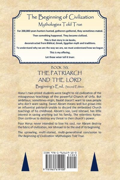 Horus's two prized students were taught to rid civilization of the misogynous teachings of the powerful Church of Urfa. But ambitious, sometimes-virgin, Baalat doesn't want to save people who don't want saving. Sweet Abram means well but grows into an influential patriarch unable to discard the embedded Church teachings of his childhood. Abram's son, Lord Ishmael, has little interest in saving anything but his family. The relentless Kyrios-Olon continue to destroy any threat to their church's power. Poor Horus never intended to lose his soul, nor Abram destroy the fabric of civilization, nor Ishmael to be the end of its beginning. The sprawling, multi-storied, multi-generational conclusion to The Beginning of Civilization: Mythologies Told True.