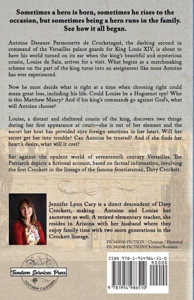 What he thought was an assignment... ...Started an American dynasty See how it all began. Antoine, the dashing palace guard at King Louis XIV's Versailles, has his world upturned when the king's beautiful and mysterious cousin arrives. What begins as an assignment becomes an encounter filled with intrigue and suspense. He must decide between love and duty where the wrong choice could mean his life. The king's sheltered cousin Louise discovers two things while at court: She is out of her element. And her provided escort stirs foreign emotions in her heart. Is Louise a Huguenot spy? Can Antoine be trusted? Will her secret get her into trouble? And if the king's commands go against God's, what will Antoine choose? Set against the opulent world of seventeenth century Versailles, you will love The Patriarch as it depicts a fictional account, based on fact, involving the first Crockett in the lineage of the famous frontiersman, Davy Crockett, because everyone loves a hero.