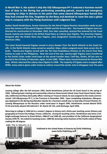 In World War II, the author's ship the USS Albuquerque PF-7 endured a fourteen month tour of duty in the Bering Sea performing unending patrols, escorts and emergency steaming to ships in distress to the point that some aboard Albuquerque feared that they had crossed the line, forgotten by the Navy and destined to roam the seas a ghost ship in company with the Flying Dutchman until Judgment Day. Author David Hendrickson, former historian for the Patrol Frigate Reunion Association seeks to preserve the memory of the patrol frigates of WWII and the Korean War. One hundred frigates were authorized for construction in December 1942, four later cancelled, seventy-five manned by the Coast Guard, twenty-one loaned to the British Royal Navy as Colony-class frigates. The American frigates, designed after the British River-class frigates, were designated Tacoma-class, all named for small American cities. The Coast Guard-manned frigates served in every theater from the North Atlantic to the South Pacific. In the North Atlantic many served as weather ships, others assigned escort duty across the Atlantic. Twenty-one frigates served with the 7th Fleet Amphibious Division on the march from New Guinea to Leyte in the Philippines. Near the end of the war, twenty-eight frigates were transferred to the Soviet Union under Lend-Lease at the secret transfer base, Cold Bay, Alaska. All but one returned to the US Navy at Yokosuka, Japan, in late 1949. Fifteen were recommissioned for Korean War duty. Britain returned the colony-class frigates in 1946. The majority of frigates were scrapped after WWII, many sold or given under treaty to nations around the world, only to disappear over the years. About the Author Leaving college after the fall semester 1942, David Hendrickson joined the US Coast Guard in the spring of 1943. Following basic training and seamanship school on Government Island, (now Coast Guard Island, Alameda, California) and Navy deck petty officer training on Treasure Island, he was assigned to the newly commissioned USS Albuquerque PF-7, in San Francisco in December 1943. Upon completing shakedown, Albuquerque deployed to the Bering Sea/Aleutian Islands for a fourteen-month tour as lead ship of Escort Division 27. Leaving Albuquerque to the Russians under Lend-Lease in August 1945, Hendrickson served aboard USCG FS-34 and lastly aboard USS Admiral E. W. Eberle AP 123, until discharge, April 1946. Returning to college in 1946 led to a master's degree in history and a thirty-year teaching career (history and geography) at Fresno City College, Fresno, California. During his teaching career, Hendrickson was twice a Fulbright exchange lecturer to Great Britain, 1966-67 and 1981-82, and president of the California Geographical Society 1978-79. He ended his teaching career, 1989-90, lecturing native teachers of the Pacific nation of Palau seeking the AB degree.