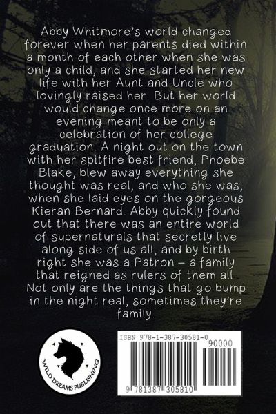 Abby WhitmoreÕs world changed forever when her parents died within a month of each other when she was only a child, and she started her new life with her Aunt and Uncle who lovingly raised her. But her world would change once more on an evening meant to be only a celebration of her college graduation. A night out on the town with her spitfire best friend, Phoebe Blake, blew away everything she thought was real, and who she was, when she laid eyes on the gorgeous Kieran Bernard. Abby quickly found out that there was an entire world of supernaturals that secretly live along side of us all, and by birth right she was a Patron Ð a family that reigned as rulers of them all. Not only are the things that go bump in the night real, sometimes theyÕre family.
