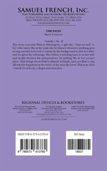 p>Comedy Barry Conners Characters: 5 male, 4 female, but can be doubled. The story concerns Patricia Harrington, a girl who "runs second" to her older sister. She is the patsy who is blamed whenever anything goes wrong, and is forced to remain in the background in order that her sister may be presentd to advantage. Her father, a traveling man, is on her side, and finally declares his independence by putting Ma in her proper place. This brings about Patsy's ultimate triumph, and, needless to say, affords her happiness as the bride of the man she loves. This is an ideal comedy for schools, colleges and churches.