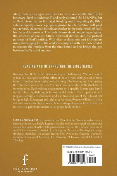 Many readers may agree with Peter in his second epistle, that Paul's letters are "hard to understand" and easily distort (3:15-16, NIV). But as David Ackerman in this latest Reading and Interpreting the Bible volume expertly shows, a proper approach to interpretation will yield rich rewards. Ackerman introduces readers to the social world of Paul, his life, and his mission. The reader learns about competing religions, the structure of ancient letters, rhetorical devices, and the pastoral purposes of Paul's writing. With clear explanations and illustrations using challenging texts, the reader is equipped with the tools needed to separate the timeless from the time-bound and to bridge the gap between Paul's world and ours. Reading the Bible with understanding is challenging. Without sound guidance, making sense of the different literary types, settings, and cultures found in the Scriptures can be overwhelming. The Reading and Interpreting the Bible Series opens the door to a proper and accessible method of biblical interpretation. Each volume concentrates on a specific literary type found in the Bible, highlighting its features and function. Social, political, and religious settings are examined, and a critical analysis of the biblical text brings to light its message and relevance for today. Readers will find in these volumes numerous illustrations of how to interpret specific texts, which can be used as a pattern for individual or group Bible studies.