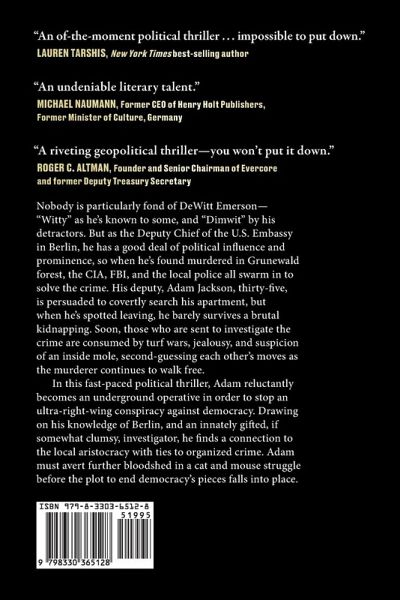 Nobody is particularly fond of DeWitt Emerson-"Witty" as he's known to some, and "Dimwit" by his detractors. But as the Deputy Chief of the U.S. Embassy in Berlin, he has a good deal of political influence and prominence, so when he's found murdered in Grunewald forest, the CIA, FBI, and the local police all swarm in to solve the crime. His deputy, Adam Jackson, thirty-five, is persuaded to covertly search his apartment, but when he's spotted leaving, he barely survives a brutal kidnapping attempt. Soon, those who are sent to investigate the crime are consumed by turf wars, jealousy, and suspicion of an inside mole, second-guessing each other's moves as the murdered continues to walk free. In this fast-paced political thriller, Adam reluctantly becomes an underground operative in order to stop an ultra-right-wing conspiracy against democracy. Drawing on his knowledge of Berlin, and an innately gifted, if somewhat clumsy investigator, he finds a connection to the local aristocracy with ties to organized crime. Adam must avert further bloodshed in a cat and mouse struggle before the plot to end democracy's pieces falls into place.