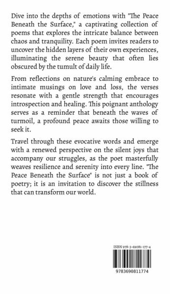 Dive into the depths of emotions with "The Peace Beneath the Surface," a captivating collection of poems that explores the intricate balance between chaos and tranquility. Each poem invites readers to uncover the hidden layers of their own experiences, illuminating the serene beauty that often lies obscured by the tumult of daily life. From reflections on nature's calming embrace to intimate musings on love and loss, the verses resonate with a gentle strength that encourages introspection and healing. This poignant anthology serves as a reminder that beneath the waves of turmoil, a profound peace awaits those willing to seek it. Travel through these evocative words and emerge with a renewed perspective on the silent joys that accompany our struggles, as the poet masterfully weaves resilience and serenity into every line. "The Peace Beneath the Surface" is not just a book of poetry; it is an invitation to discover the stillness that can transform our world.