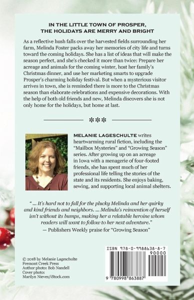 As a reflective hush falls over the harvested fields surrounding her farm, Melinda Foster packs away her memories of city life and turns her thoughts toward the coming holidays. She has a list of ideas that will make the season perfect, and she’s checked it more than twice: Prepare her acreage and its animals for the coming winter, host her first family Christmas dinner, and use her marketing smarts to upgrade Prosper’s charming holiday festival. But when a mysterious visitor arrives, Melinda is reminded there is more to the Christmas season than elaborate celebrations and expensive decorations. With the help of both old friends and new, Melinda discovers she is not only home for the holidays, but home to stay. The sequel to "Harvest Season." Third in a series!